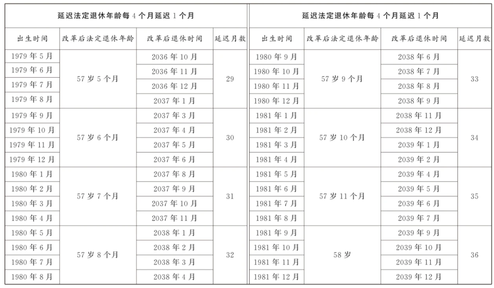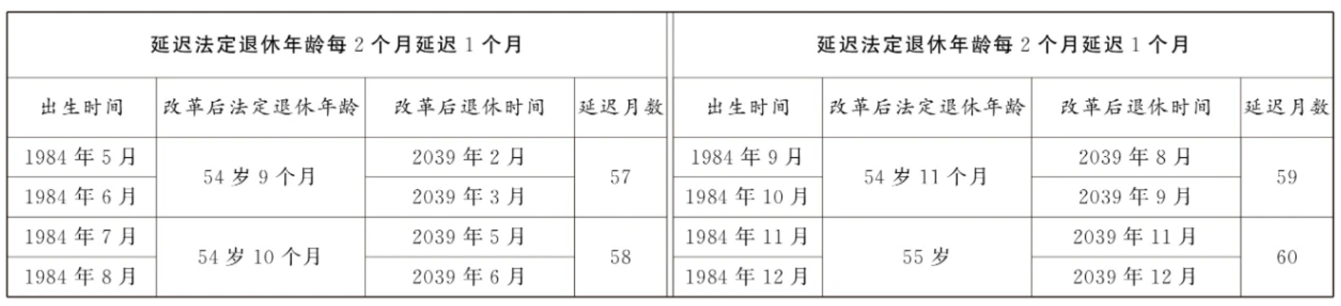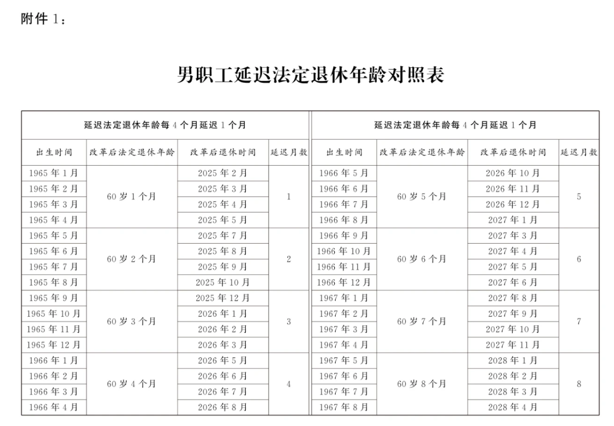 第一條?從2025年1月1日起,男職工和原法定退休年齡為五十五周歲的女職工,法定退休年齡每四個月延遲一個月,分別逐步延遲至六十三周歲和五十八周歲;原法定退休年齡為五十周歲的女職工,法定退休年齡每二個月延遲一個月,逐步延遲至五十五周歲。國家另有規(guī)定的,從其規(guī)定。