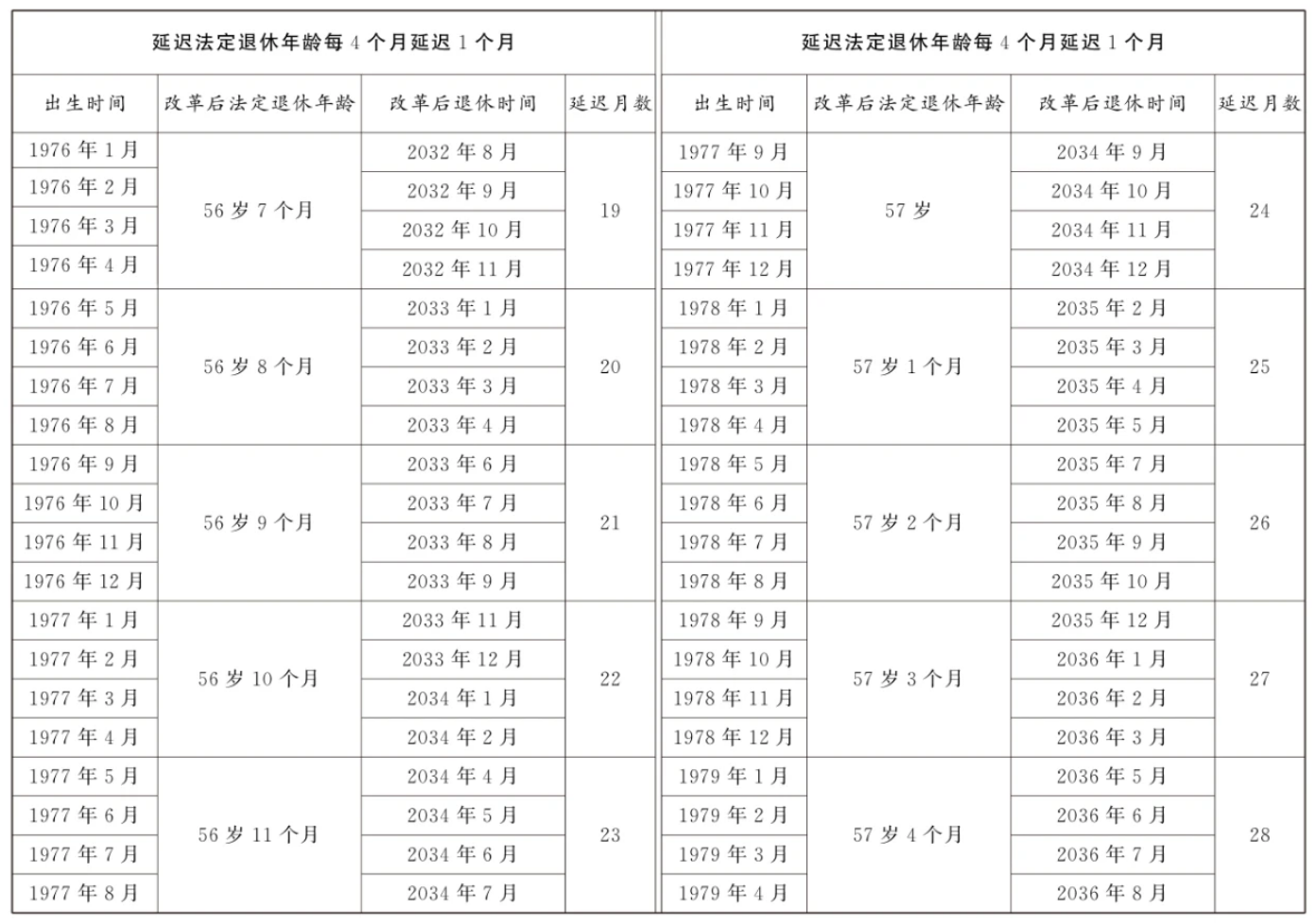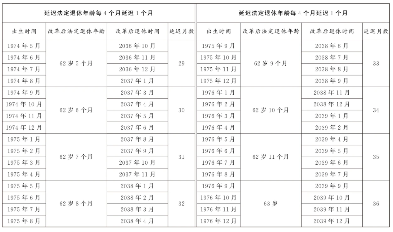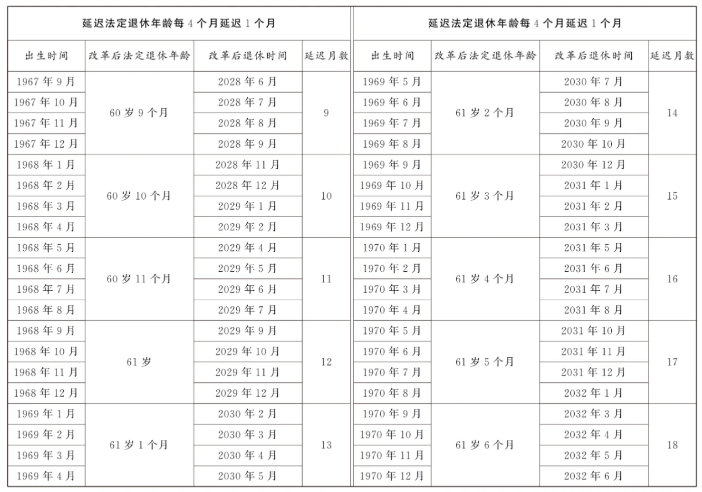 第一條?從2025年1月1日起,男職工和原法定退休年齡為五十五周歲的女職工,法定退休年齡每四個月延遲一個月,分別逐步延遲至六十三周歲和五十八周歲;原法定退休年齡為五十周歲的女職工,法定退休年齡每二個月延遲一個月,逐步延遲至五十五周歲。國家另有規(guī)定的,從其規(guī)定。