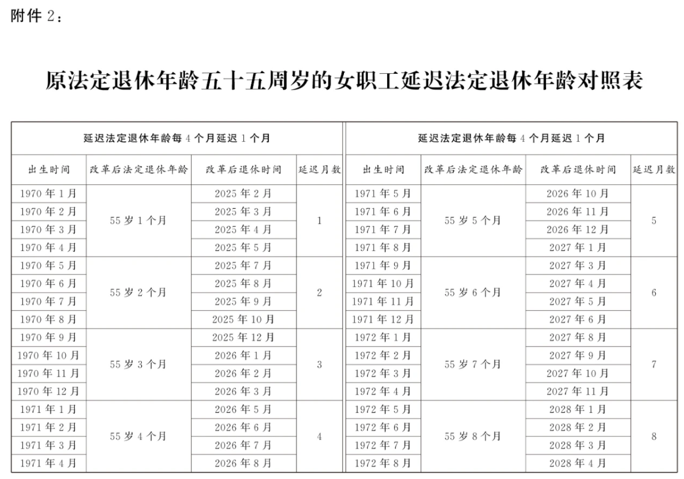 2.原法定退休年齡五十五周歲的女職工延遲法定退休年齡對照表