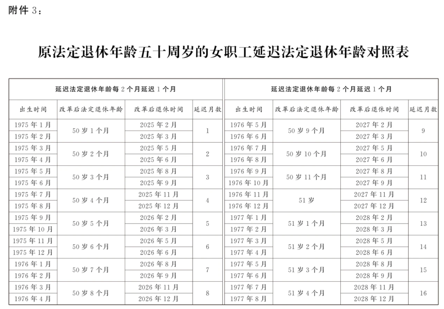 3.原法定退休年齡五十周歲的女職工延遲法定退休年齡對照表