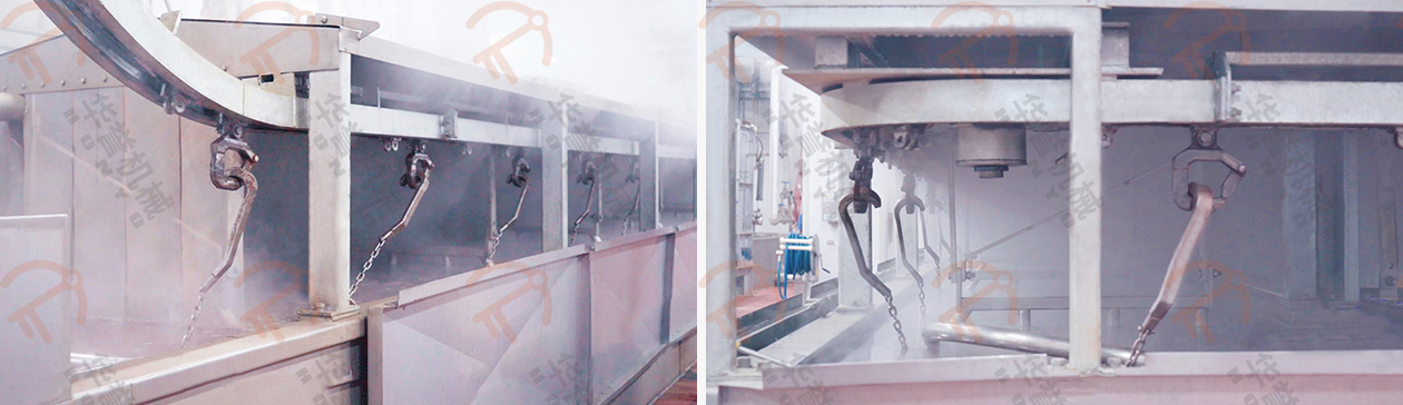 經(jīng)過打毛之后豬體,通過滑槽滑入清水池中由工人進行清洗,清洗過后由人工轉掛的方式送入噴淋輸送間,噴淋過后再輸送到拍打清洗設備之中再次進行沖洗。