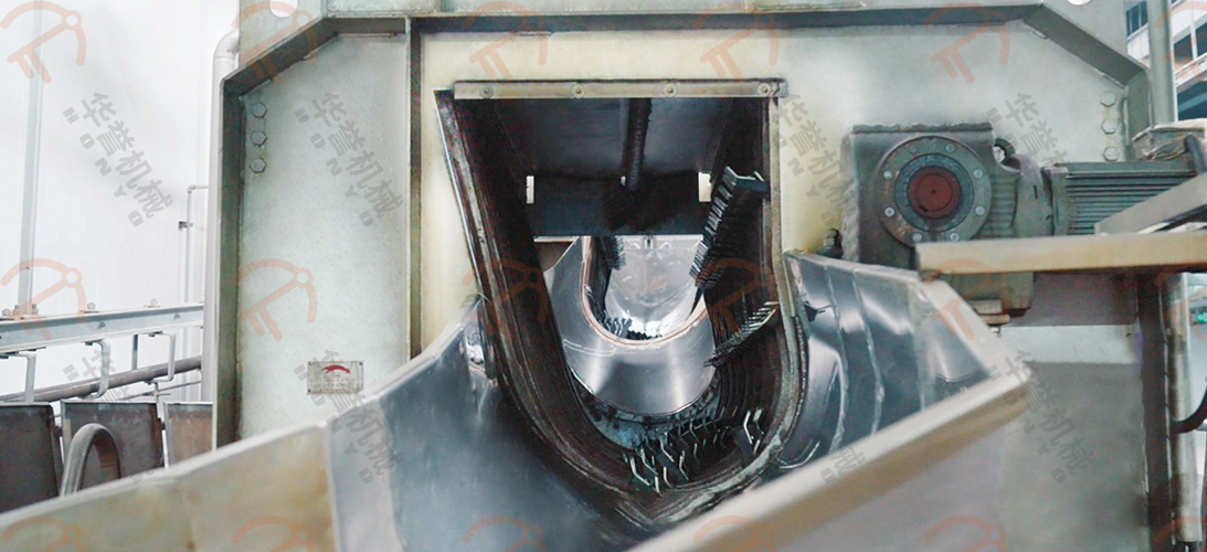 浸燙后的毛豬進入螺旋打毛機,該設備由兩臺組成,給進入的毛豬進行正反轉打毛,打毛率在98%以上。豬毛經(jīng)過下方的豬毛收集槽進入豬毛處理間。