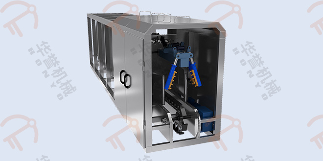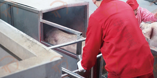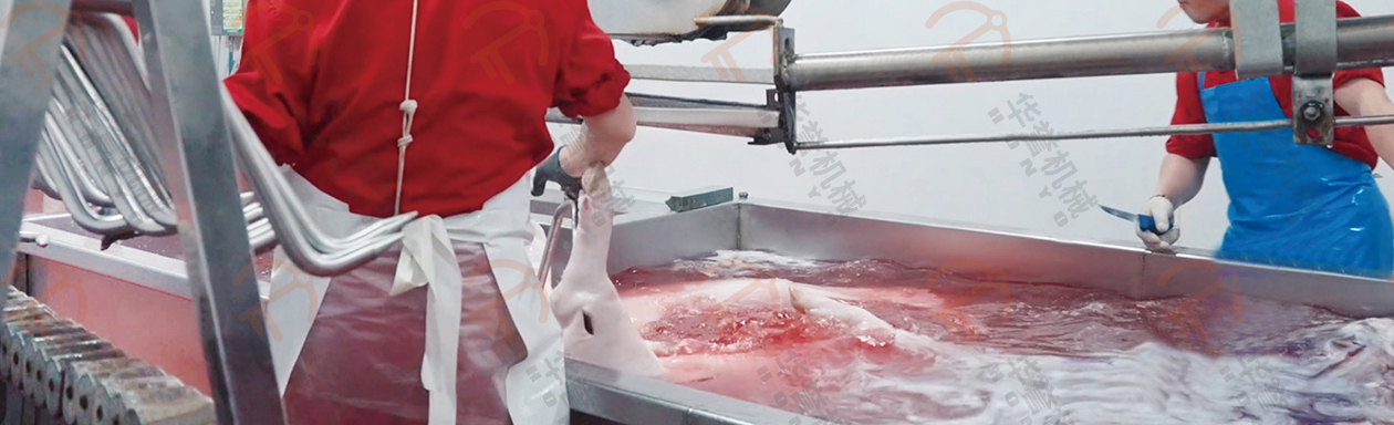 瀝血后的毛豬通過瀝血輸送線運送到運河式燙毛池前,通過下降機將毛豬浸在池內進行燙毛。運河式燙毛池可實現(xiàn)人工或PLC遠程控制操作,實現(xiàn)精準控溫,更具有使用成本低、燙毛均勻、循環(huán)水方向與豬體輸送方向相反等優(yōu)勢。