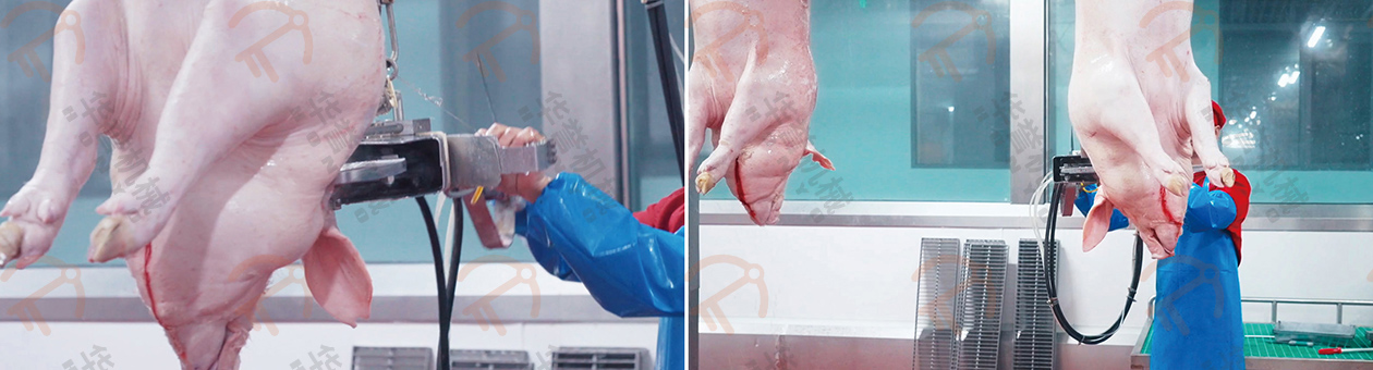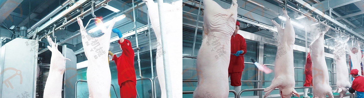 沖洗后的豬胴體由人工進行表面燎毛、修刮處理,進一步的去除豬胴體表面的細毛,確保最終產品的清潔度和美觀度。通過高溫處理,可以有效殺死表面的細菌,提高衛(wèi)生標準。