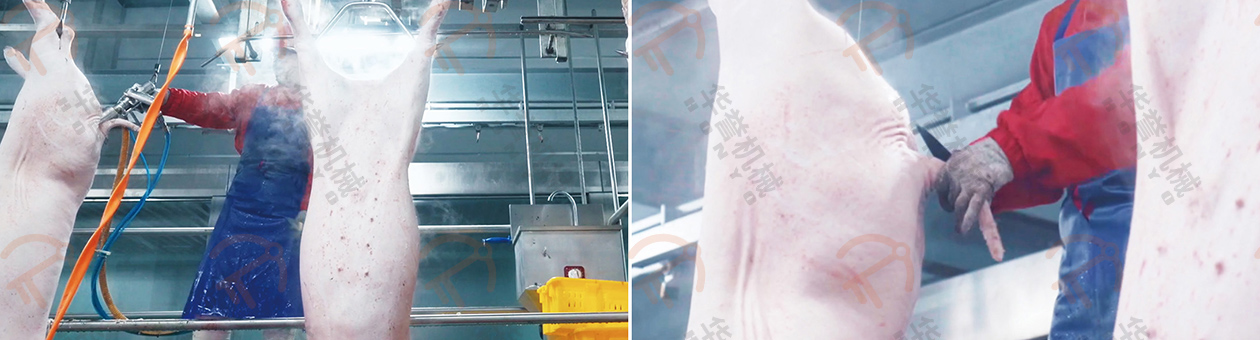 燎毛、修掛后由工人對豬的肛門進行封閉處理,以防止內臟和血液流出,確保屠宰過程的衛(wèi)生和順利進行。封肛后由工人去掉豬尾,再次送入拍打清洗設備進行處理。