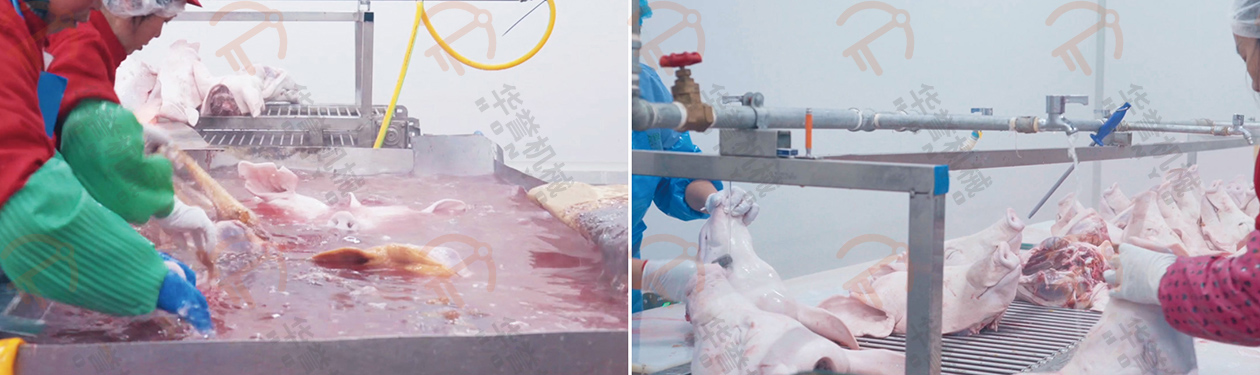 剪下豬頭運送到專門的修刮清洗區(qū)域,由工人進行細節(jié)上的處理。