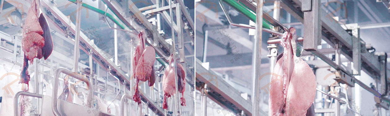 取下后的白臟放入白臟盤內,紅臟掛到紅臟鉤上,經(jīng)衛(wèi)生檢疫沒問題后,通過輸送線送入紅白臟處理間。(白臟:胃、腸等部分;紅臟:心、肝、肺等紅色內臟部分)
