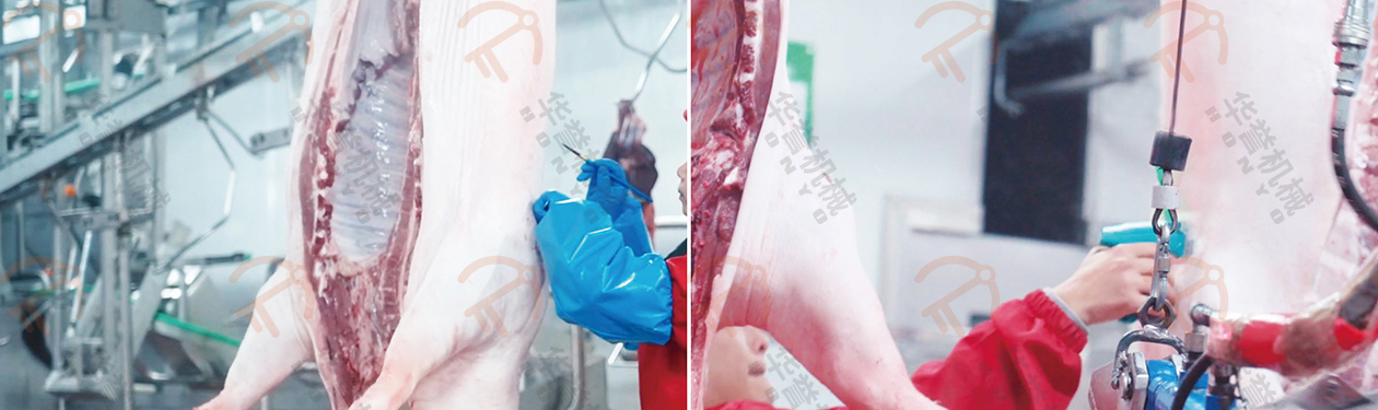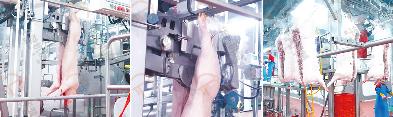 取完紅白臟的豬胴體由輸送線送入自動劈半機,該設備能精準跟蹤定位并于輸送線保持同步,劈半后無肉末產生,胴體切口處無發(fā)黑現(xiàn)象,能大幅提高劈半處理效率。