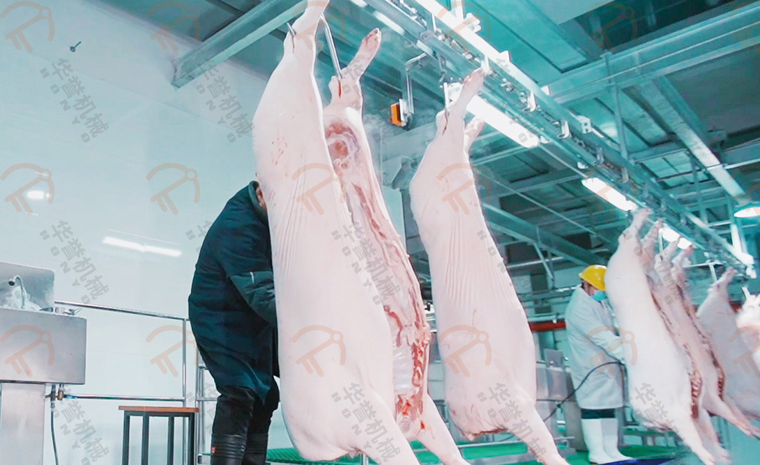 去頭后的豬胴體在輸送線上由工人完成開胸操作。