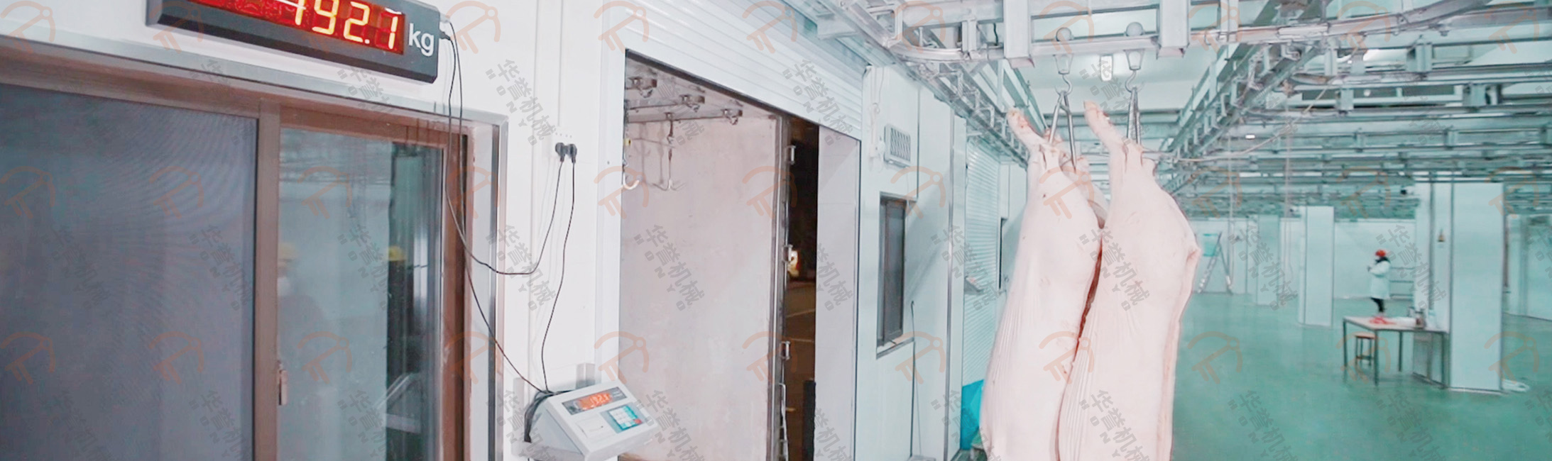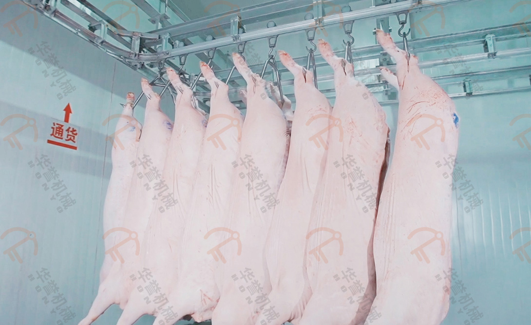 處理好的豬胴體,再次進行復檢蓋章,確保豬肉符合國家標準。再將豬胴體通過輸送線運至快冷間,快速冷卻屠宰后的豬胴體,以減少干耗、延緩微生物繁殖,并提高肉品質量。