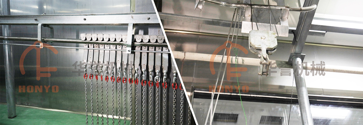 主要用于懸掛并翻轉(zhuǎn)動物,以便進(jìn)行放血操作,有助于去除動物體內(nèi)的血液,減少潛在的寄生蟲、細(xì)菌等微生物風(fēng)險。